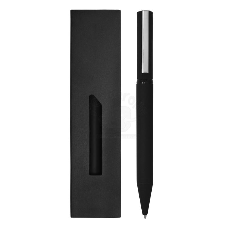 Caneta de metal para brindes giratória e carga azul. Acondicionada em embalagem de cartonagem.