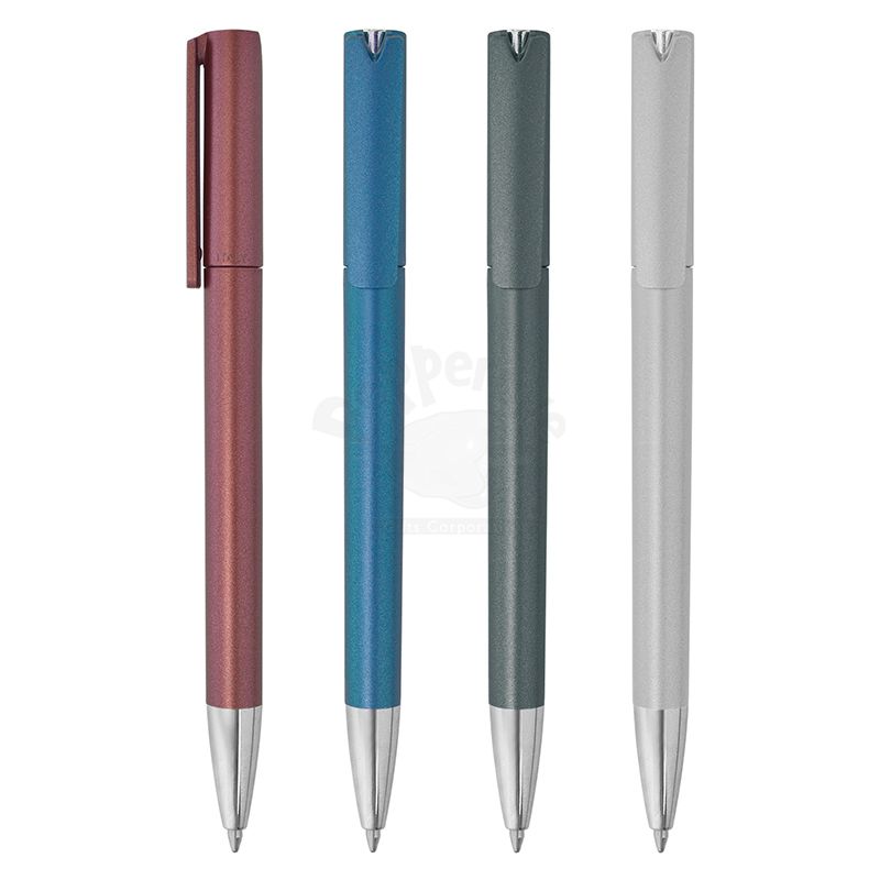 Caneta esferográfica para brindes corporativos. Possui acabamento metalizado, ponteira de metal, tinha Dokumental e 2,5km de escrita. As cores metalizadas conferem o toque final de elegância e exclusividade, com design criativo e arrojado.