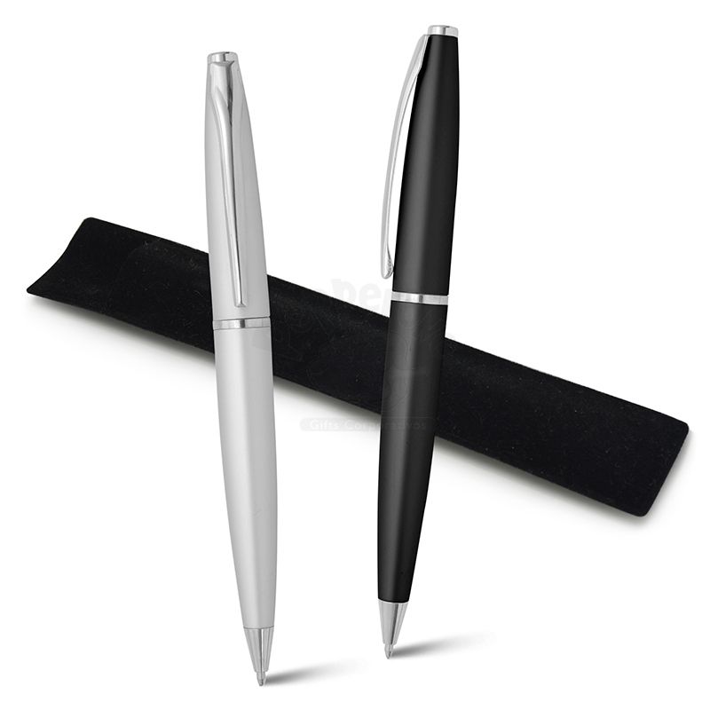 Caneta esferográfica de metal para dar de brindes promocionais. Possui 1,5km de escrita na cor azul. Acompanha embalagem de veludo.
