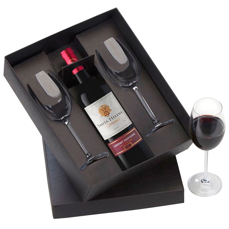 Kit vinho para dar de brinde. Acompanha 1 garrafa de vinho de 750ml e 2 taças de 350ml.
