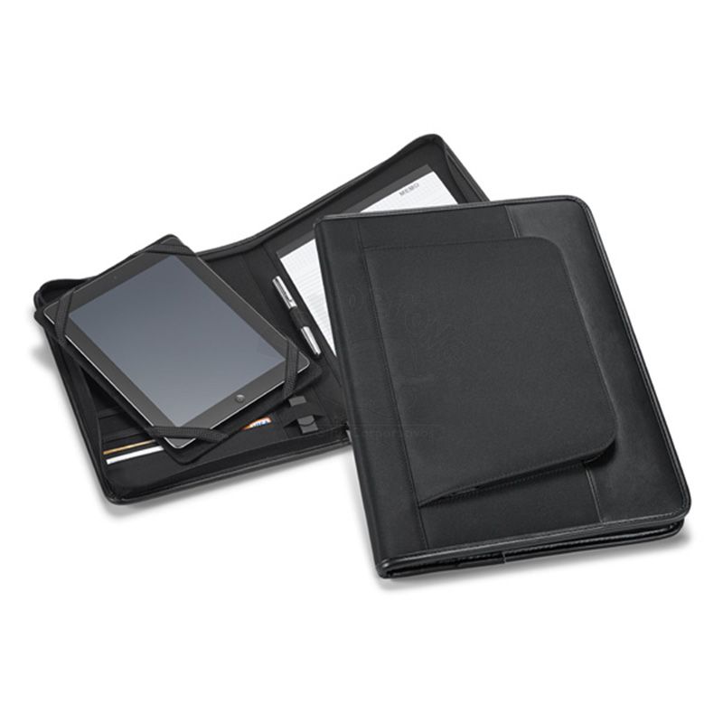 Produzida em couro sintético e microfibra. Possui bloco, exterior com zíper e interior com suporte para tablet ( 10,1” e 7”). Bloco: 20 folhas pautadas. Caneta esferográfica e pen drive não inclusas.