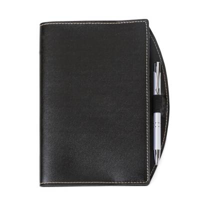 Bloco de Anotações produzido em couro sintético, bloco interno com aproximadamente 80 folhas sem pautas.