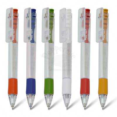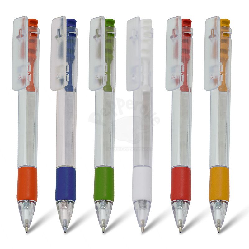 Confeccionada em material plástico, possui acionamento por click, corpo translúcido, ponteira esferográfica com carga azul clip resistente.