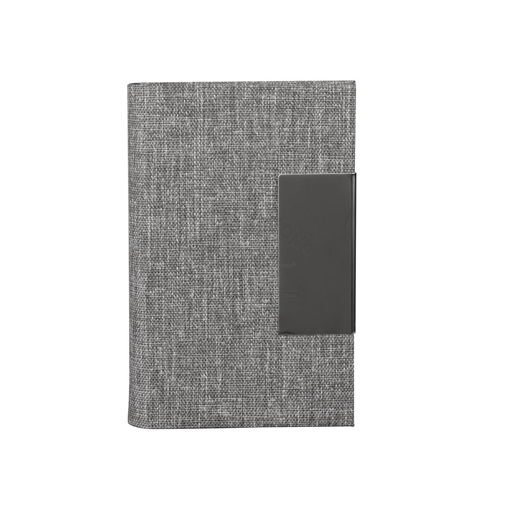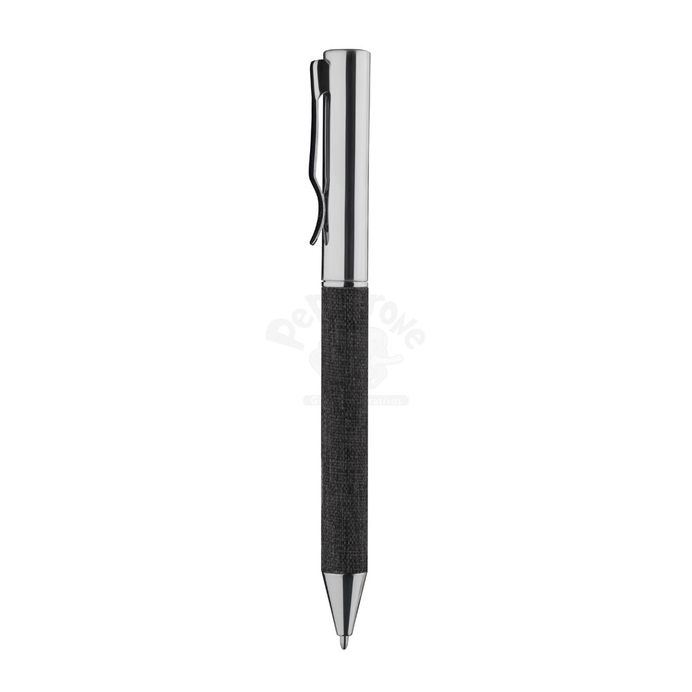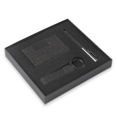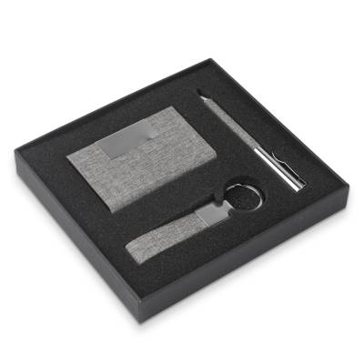 Kit Escritório com 3 peças personalizadas, possui 1 porta cartão com detalhe diferenciado em couro sintético, 1 chaveiro fumê com acabamento brilhante e 1 caneta esferográfica azul com detalhes em prata, clip de metal e acionamento da escrita por giro. Ideal para divulgar sua empresa em eventos corporativos, brindes personalizados e campanhas promocionais.