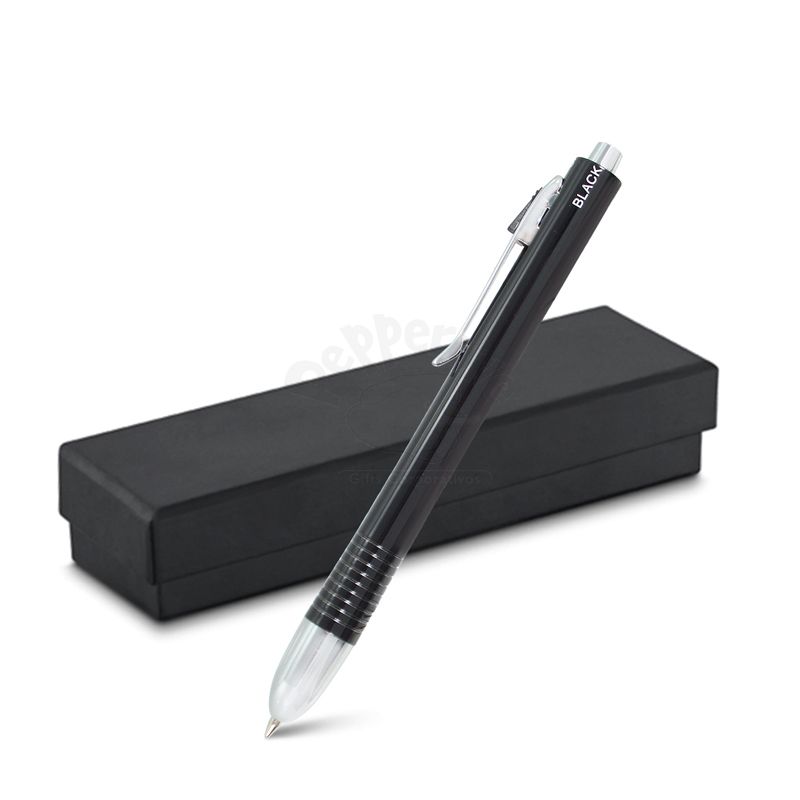 Com 3 cores de carga ( azul, preto, vermelho) e lapiseira com grafite de 0,5. Acionadas através do click da caneta.