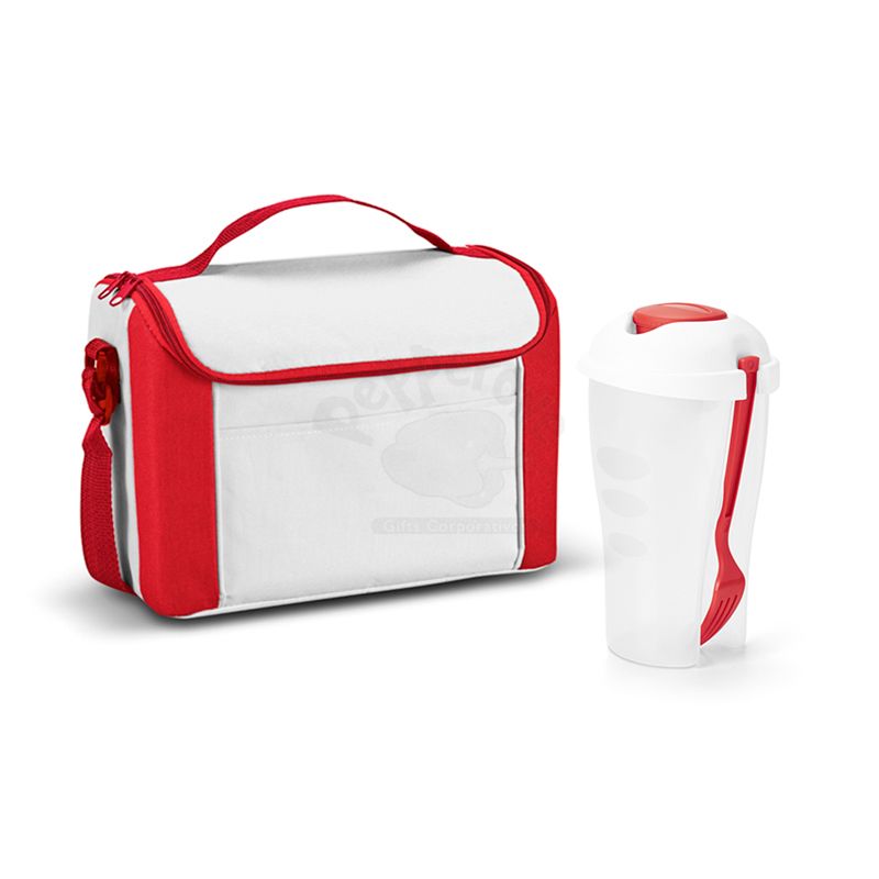 Confeccionada em Poliéster 600D, acompanha 1 copo para Salada de 800ml,1 garfo e 1 mini pote para molho, possui abertura em zíper superior, pala com 2 cursores e revestimento térmico interno para conservar bebidas e alimentos por mais tempo.