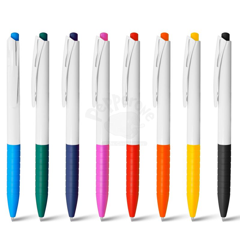 Caneta plástica personalizada com design inovador possui clip personalizado e detalhe emborrachado facilitando uma escrita macia e confortável.