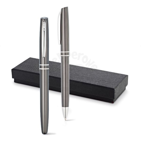 Conjunto de esferográfica e roller ball personalizada. Possui uma escrita macia e confortável com um estojo elegante em cartonagem. Ideal para brindes promocionais e eventos corporativos.