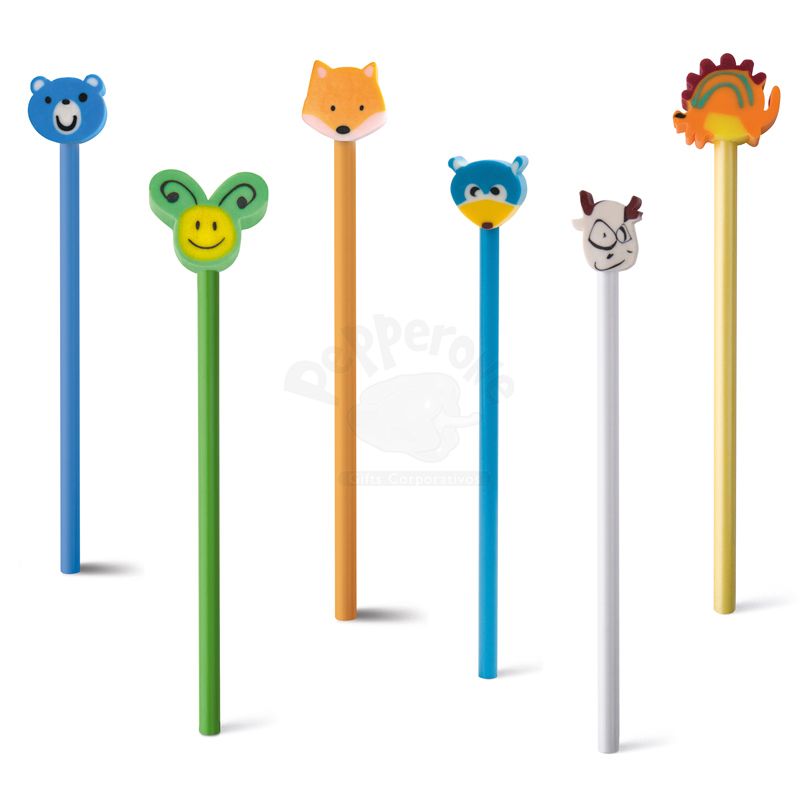 Lapis personalizado com borracha no formato de bonequinhos infantis. Ideal para eventos promocionais e brindes corporativos.