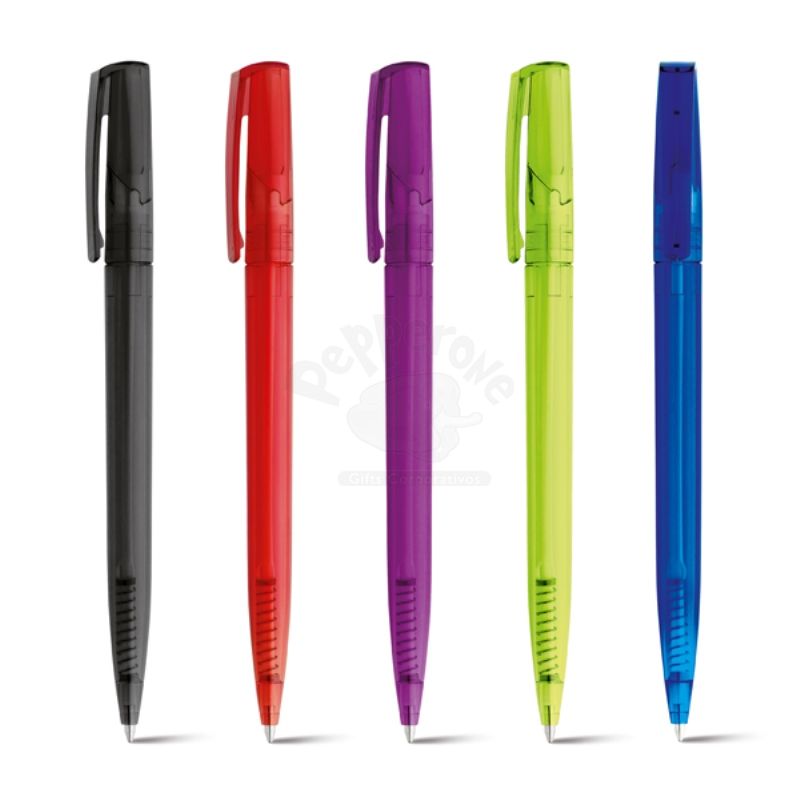 Caneta plástica personalizada com design inovador possui clip personalizado e detalhe emborrachado facilitando uma escrita macia e confortável.