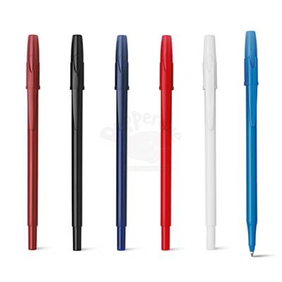 Caneta plástica produzida com acabamento brilhante, possui esferográfica na cor azul com tampa e clip personalizado. Ideal para eventos corporativos e brindes promocionais.