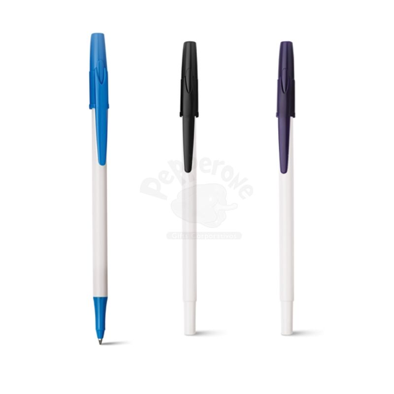 Caneta plástica produzida com acabamento brilhante, possui esferográfica na cor preta com tampa e clip personalizado.