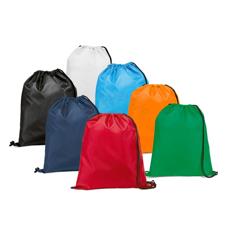Mochila saco em 210D, possui alças para costa e fechamento superior. Ideal para brindes promocionais e eventos corporativos.