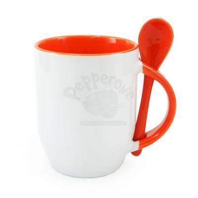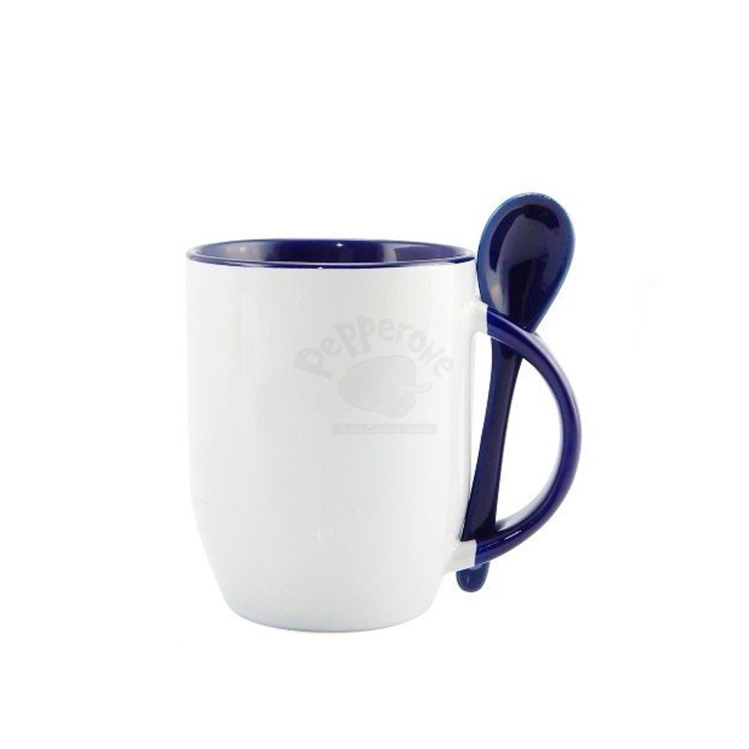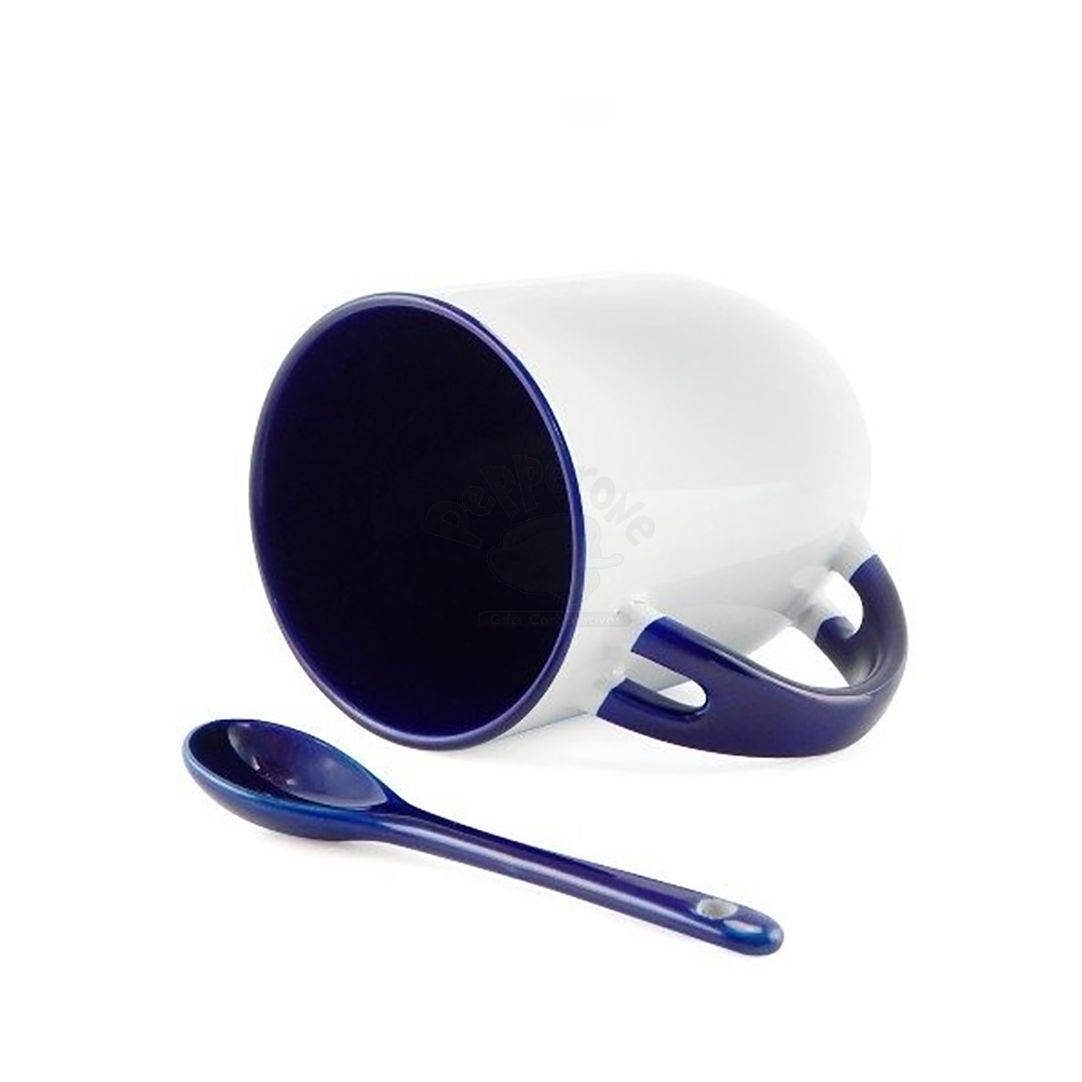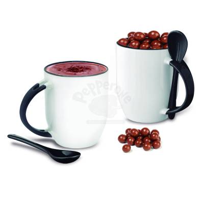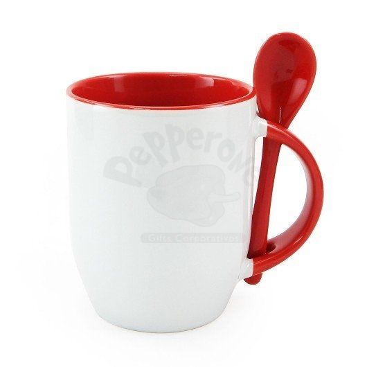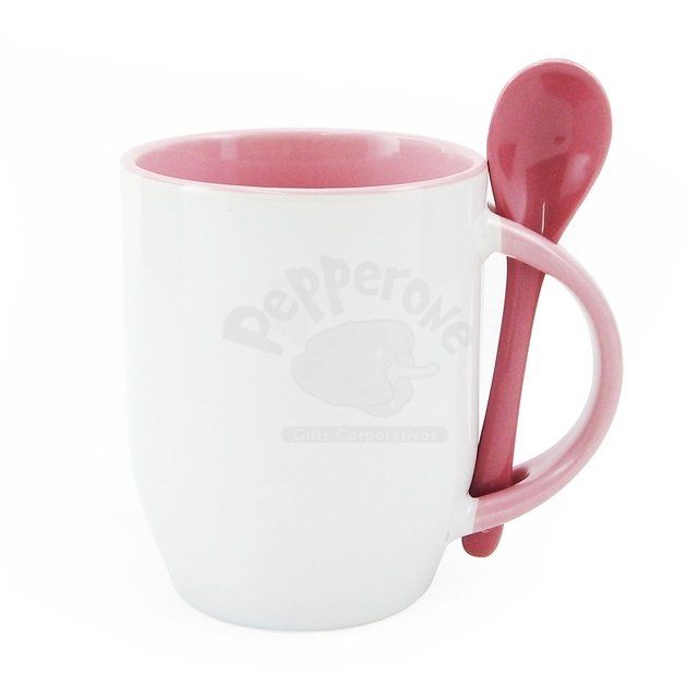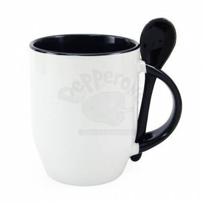 Caneca de porcelana com capacidade para 325 ml, possui colher de cerâmica que é facilmente acoplada na própria alça da caneca e interior preto com acabamento em alto brilho. Permite gravação em sublimação sem limite de cores.