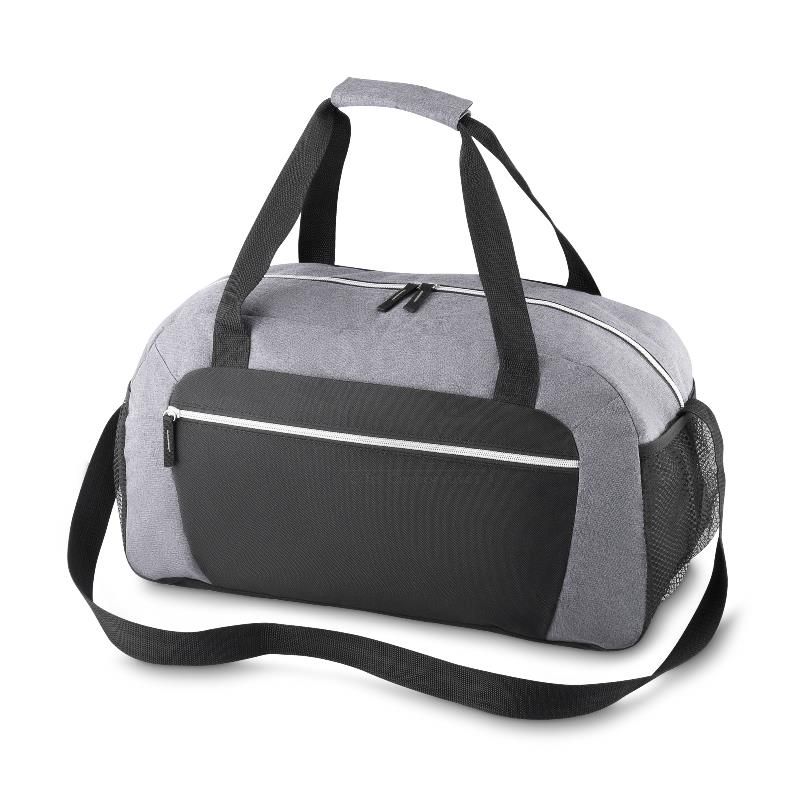 Bolsa mala de viagem esportiva personalizada produzida em poliéster com bolso frontal e superior com fechamento por zíper, alça de mão e alça de ombro regulável. Amplo espaço interno.