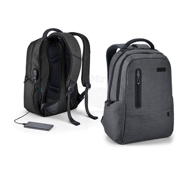 Mochila para notebook personalizada produzida em Nylon 2Tone impermeável, possui 2 compartimentos, compartimento posterior forrado com bolso interior, zíper e divisória almofadada para notebook de até 17''. Compartimento frontal forrado, com diversos bolsos interiores, 2 bolsos frontais e 2 bolsos laterais. Com porta USB e cabo USB/micro USB para ligar a dispositivos móveis (bateria portátil não inclusa). Parte posterior almofadada, com sistema de apoio acolchoado para as costas e alças almofadadas. Placa metálica removível com imã, para fácil gravação.