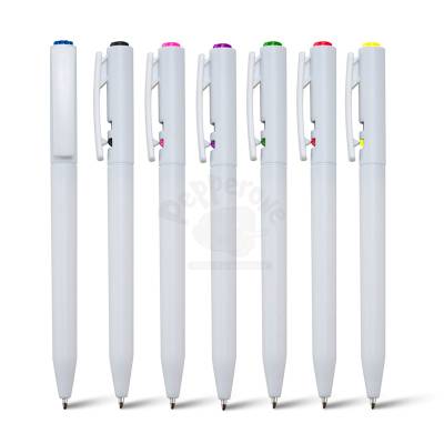 Caneta plástica personalizada com detalhe colorido, possui clip injetado e acionamento da ponteira na parte superior da caneta.