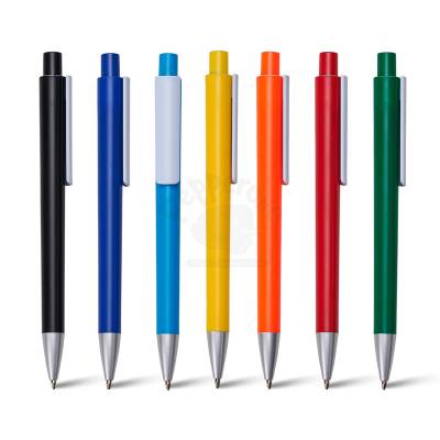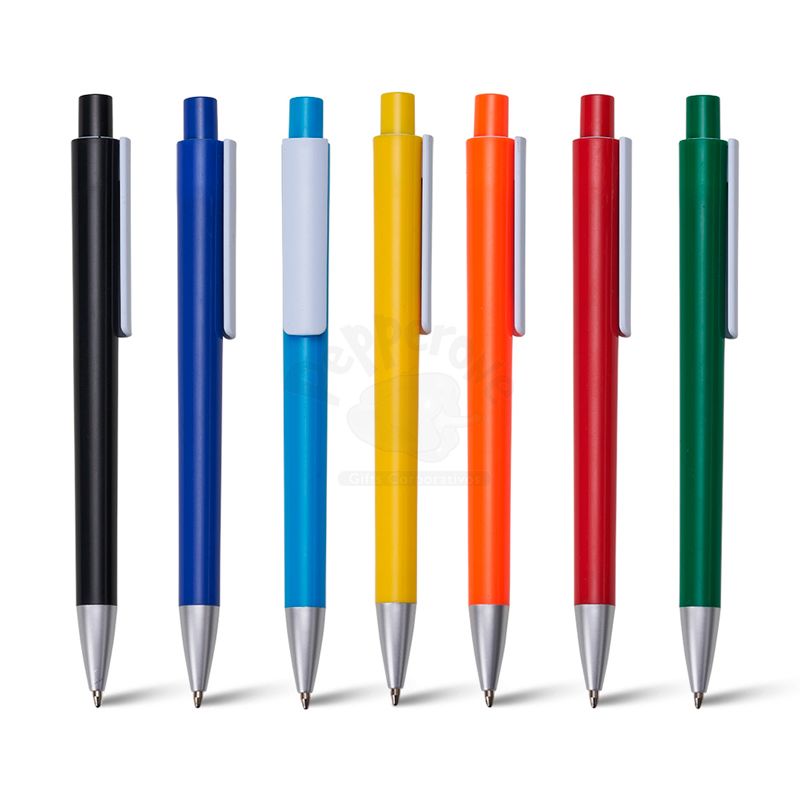 Caneta plástica personalizada com clip personalizado em um design moderno e inovador, possui esferográfica azul e acionamento da ponteira por click.