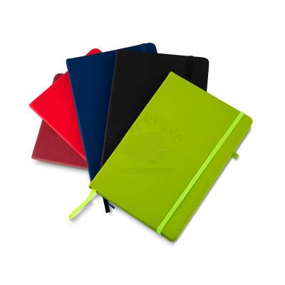 Bloco de anotações personalizado com capa dura em material sintético, suporte para caneta, elástico para fechamento, 80 folhas pautadas na cor bege e marcador de página. Caneta não acompanha o produto.