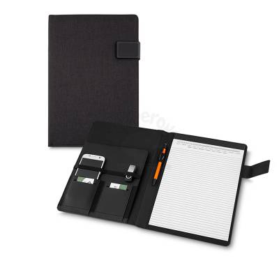 Pasta A4 Executiva Promocional Pasta executiva A4 em nylon sintético simulando tecido com fechamento magnético com placa de metal com acabamento emborrachado, Possui 20 folhas pautadas com calendário mensal e semanal, 2 compartimentos para cartões, porta caneta, compartimento para celular e objetos em fita elástica e porta documentos.