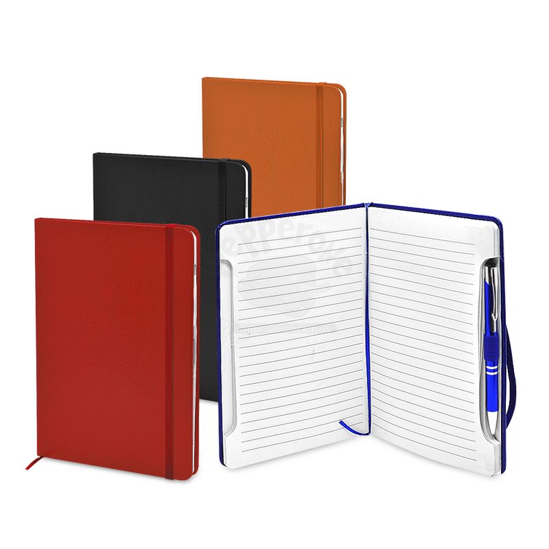 Bloco de anotações personalizado produzido em couro sintético com capa dura. Possui fechamento em elástico, marcador de pagina com fita de cetim e 80 folhas pautadas na cor branca. Incluso caneta de metal com acionamento da escrita através do click. Ideal para divulgar sua empresa em eventos corporativos, brindes personalizados e campanhas promocionais.