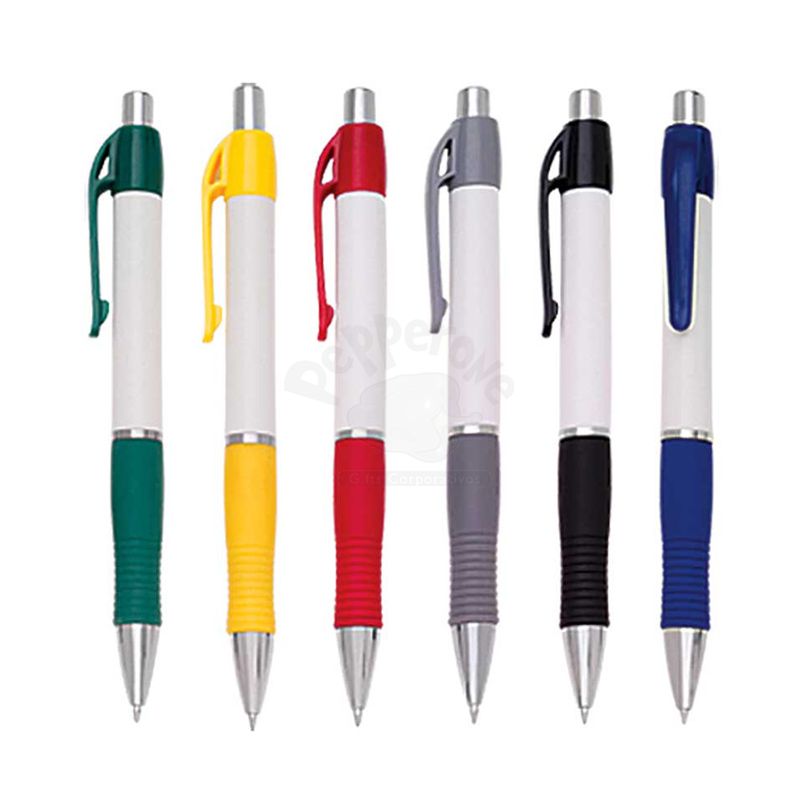 Personalizado Caneta de Plástico com click injetada com corpo branco e detalhe emborrachado coloridos. Consultar as cores