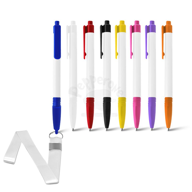 Caneta plástica personalizada com cordão, possui acionamento da escrita por clik, esferografica na cor azul e tampa com cordão em poliester no tamanho 41,5 x 1,5 cm. Ideal para divulgar sua empresa em eventos corporativos, brindes personalizados e campanhas promocionais.