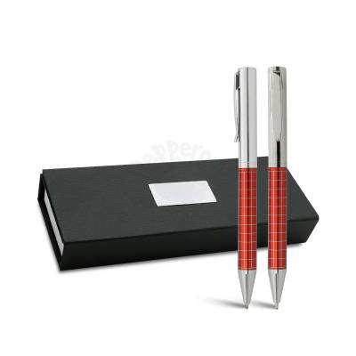 Conjunto caneta e lapiseira personalizadas produzidas em metal brilhante com detalhes quadriculados coloridos e acionamento por giro. Distribuídas em um elegante estojo com placa para gravação e revestimento interno de espuma. Ideal para presentear aquele cliente especial, distribuir em feiras e eventos corporativos.