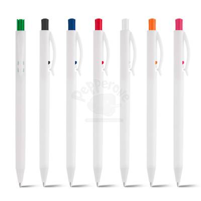 Caneta plástica personalizada com detalhe colorido, possui clip injetado e acionamento da ponteira na parte superior da caneta. Ideal para brindes promocionais e eventos corporativos.