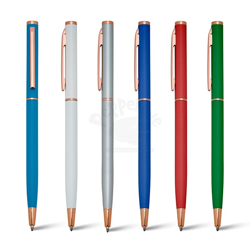 Caneta de metal personalizada com detalhes em metal dourado rosê, possui acionamento por giro, clip diferenciado de metal e esferográfica na cor azul. Ideal para brindes promocionais e eventos corporativos.