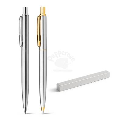 Caneta de Metal personalizada com esferográfica na cor azul e um estojo elegante em cartonagem black. Ideal para brindes promocionais e eventos corporativos. Gravação a laser na caneta. Gravação silk na embalagem sob consulta.*Tamanho do Estojo: 182 x 22 x 42 mm / Esferográfica: ø10 x 131mm