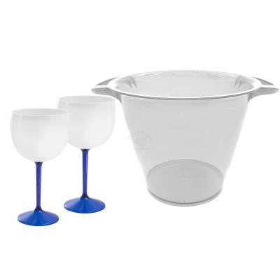 Kit Bebida contendo duas (2) taças bicolor personalizaveis produzida em PS cristal com cores translucidas e fechadas com capacidade para 550ml + um balde de gelo translucido de 4L. Ideal para brindes corporativos e eventos promocionais.