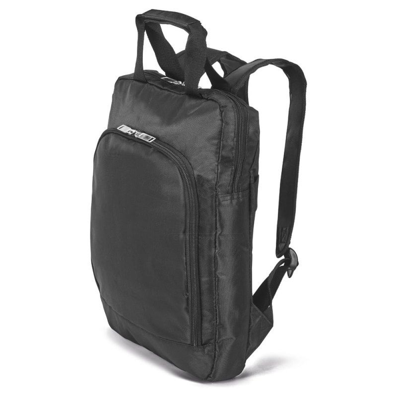 Mochila para notebook personalizada produzida em nylon 840D, possui compartimento principal para notebook de até 15''Pol, compartimento frontal para canetas, documentos e objetos pessoais, alças ajustáveis, puxadores de metal e alça de mão. Ideal para brindes promocionais e eventos corporativos. Objetos decorativos não acompanham o produto.
