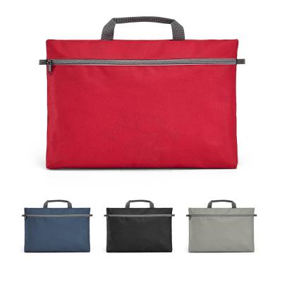 Pasta de congresso personalizada produzida em nylon 600D com alça de mão, zíper frontal e compartimento principal para documentos e objetos pessoais. Ideal para brindes promocionais e eventos corporativos.