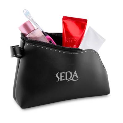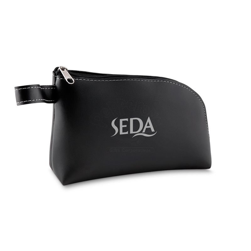 Nécessaire personalizada produzida em material sintético preto com alça lateral, zíper reforçado em metal e acabamento em costura. Ideal para brindes promocionais e eventos corporativos. Imagem ilustrativa.