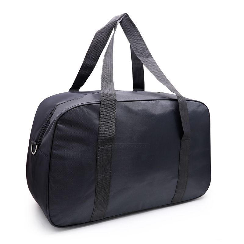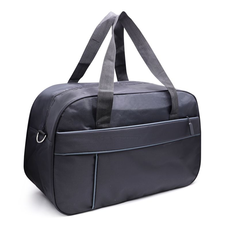 Bolsa mala de viagem esportiva personalizada produzida em nylon, possui bolso principal com fechamento por zíper, alça de mão, alça de ombro removível com engate rápido de metal, acabamento frontal em vivo reforçado, zíperes com puxadores emborrachados, pequeno bolso interno para documentos/chaves, amplo espaço interno e bolso frontal com fechamento por zíper. Ideal para brindes promocionais e eventos corporativos.
