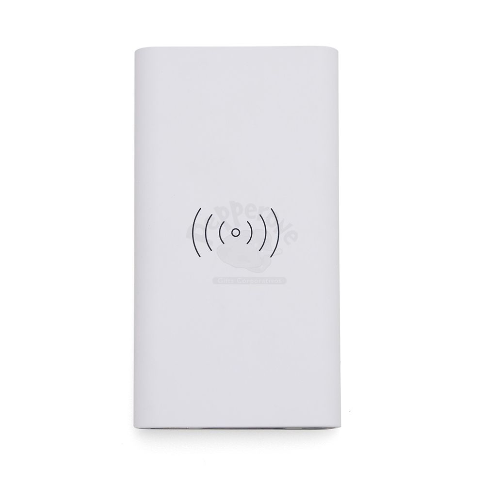 Carregador personalizado portátil de indução com 8000mAh produzido em plástico e indicadores led de bateria e indução. O carregador contém um detalhe circular emborrachado na área de indução, proporcionado mais segurança ao dispositivo conectado, evitando deslizamentos durante este modo de carga – o lado oposto da indução possui um ícone indutivo, porém é uma mera ilustração, esta área não gera carga. O carregador possui uma porta de saída USB com carga rápida e duas portas de entradas, Tipo-C e V8. Entrada: DC 5V/2.1A, Saída: DC 5V/2.1A, Saída wireless: DC 5V/1.0A, Receptor wireless: DC 5V/750mAAcompanha cabo USB e adaptador Tipo-C.