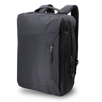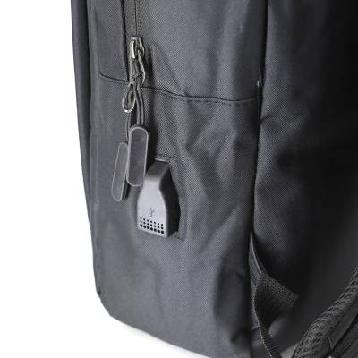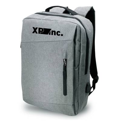 Mochila para notebook personalizada produzida em nylon com compartimento para notebook até 15,6 polegadas. Contém compartimento grande 18L com divisórias para documentos, eletrônicos e caneta, dois compartimentos frontais com abertura vertical, bolso lateral e adaptador USB externo com cabo acoplado, permitindo a conexão de um carregador portátil de dentro da mochila e transferência da carga para o lado externo, ocultando o carregador e viabilizando a utilização do celular durante o processo. Contém zíperes com pegadores plásticos, alça de mão em nylon e alças para as costas ajustáveis com revestimento espumado antitranspirante. Ideal para brindes promocionais e eventos corporativos. Power Bank não acompanha o produto. Obs: Para a entrada lateral USB funcionar como carregador, é necessário a aquisição de um de nossos Power Banks. * Imagem ilustrativa.