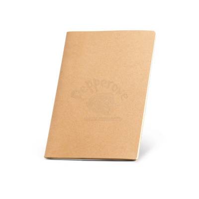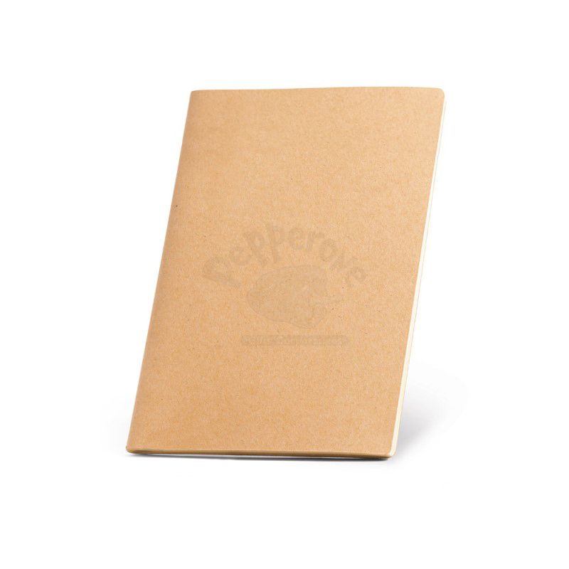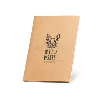 Bloco de anotações personalizado em formato A4 com capa em papel cartão (250 g/m²) e cantos redondos. Possui 40 folhas não pautadas e costuradas em papel reciclado proveniente de gestão florestal sustentável. *Imagem ilustrativa.