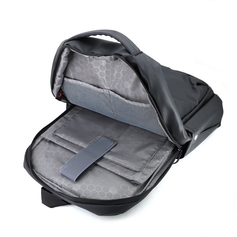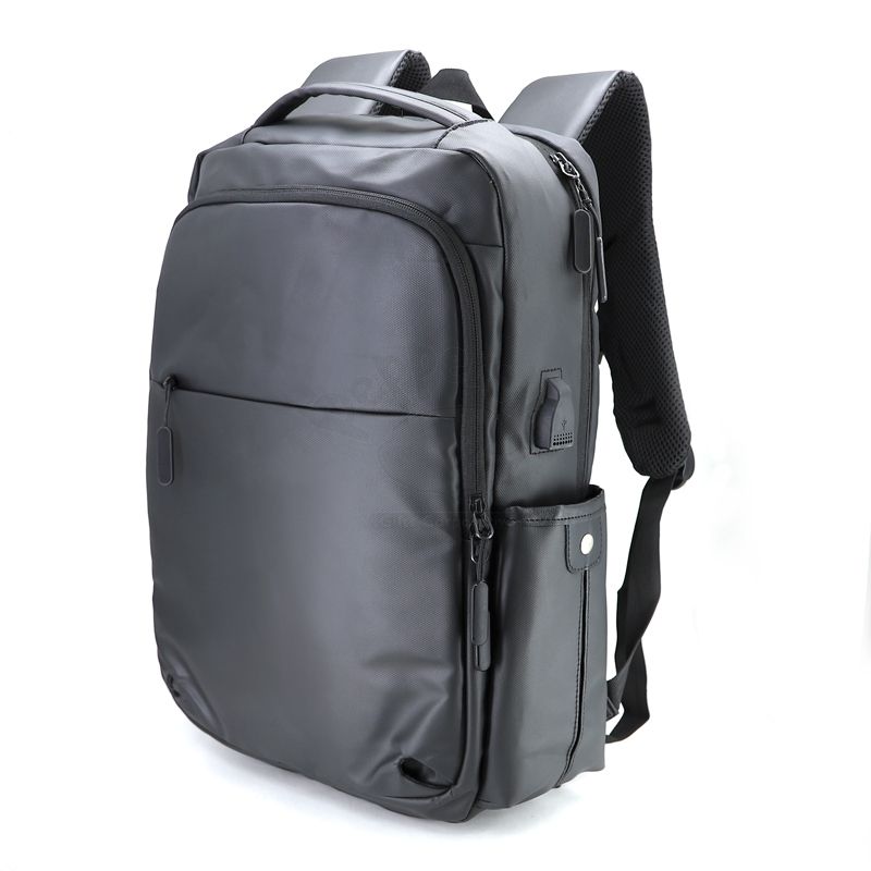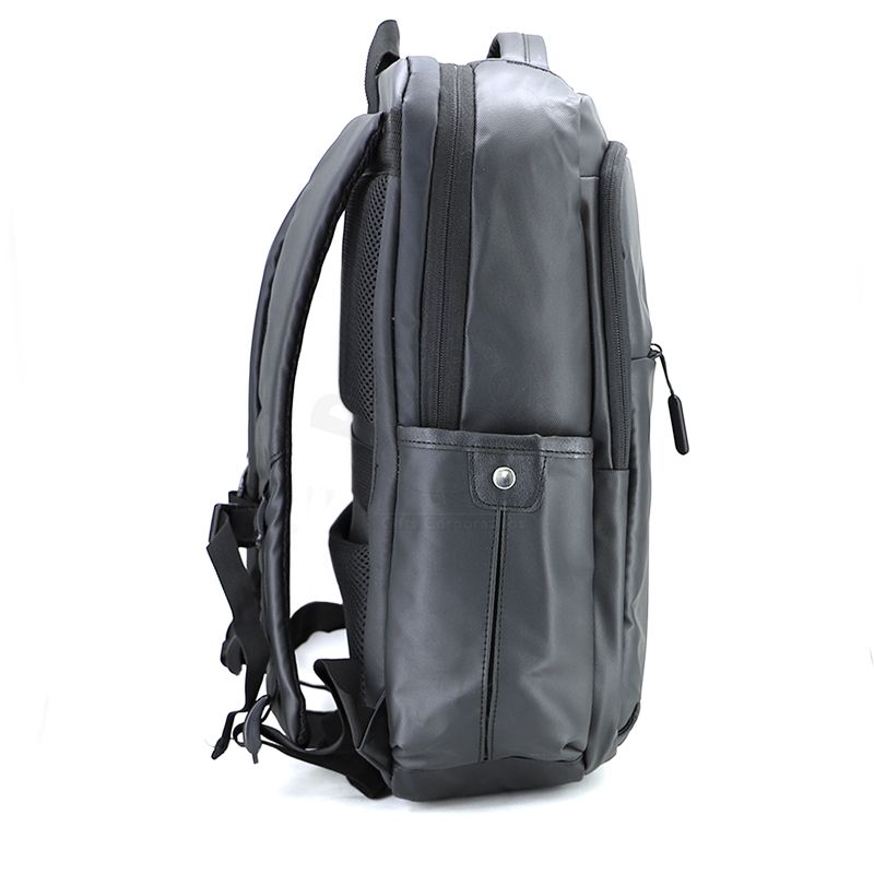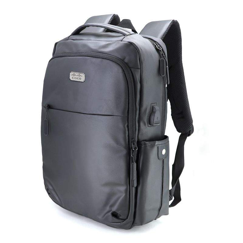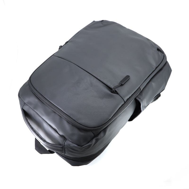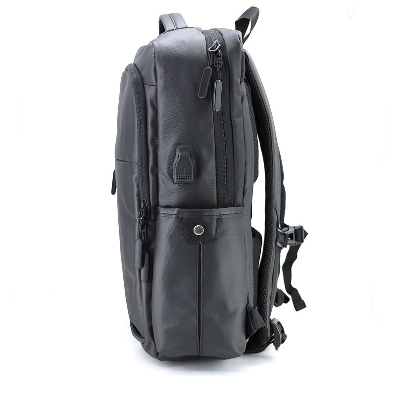 Mochila para notebook personalizada confeccionada em material sintético com compartimento para notebook até 15,6 polegadas. Contém um compartimento grande com divisórias para documentos, eletrônicos, polegadas e tablet. Dois compartimentos frontais, sendo um com divisórias para documentos, eletrônicos e caneta. Um bolso traseiro oculto. Tecido Impermeável dois bolsos laterais e adaptador USB externo com cabo acoplado, permitindo a conexão de um carregador portátil de dentro da mochila e transferência da carga para o lado externo, ocultando o carregador e viabilizando a utilização do celular durante o processo. Contém zíperes com pegadores plásticos, alça de mão em nylon, alça horizontal para encaixe em malas de viagem e alças para as costas ajustáveis com revestimento espumado antitranspirante. Imagem ilustrativa.