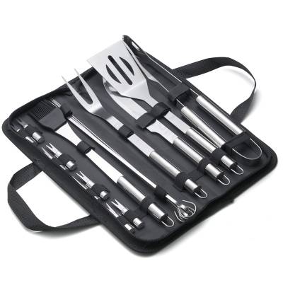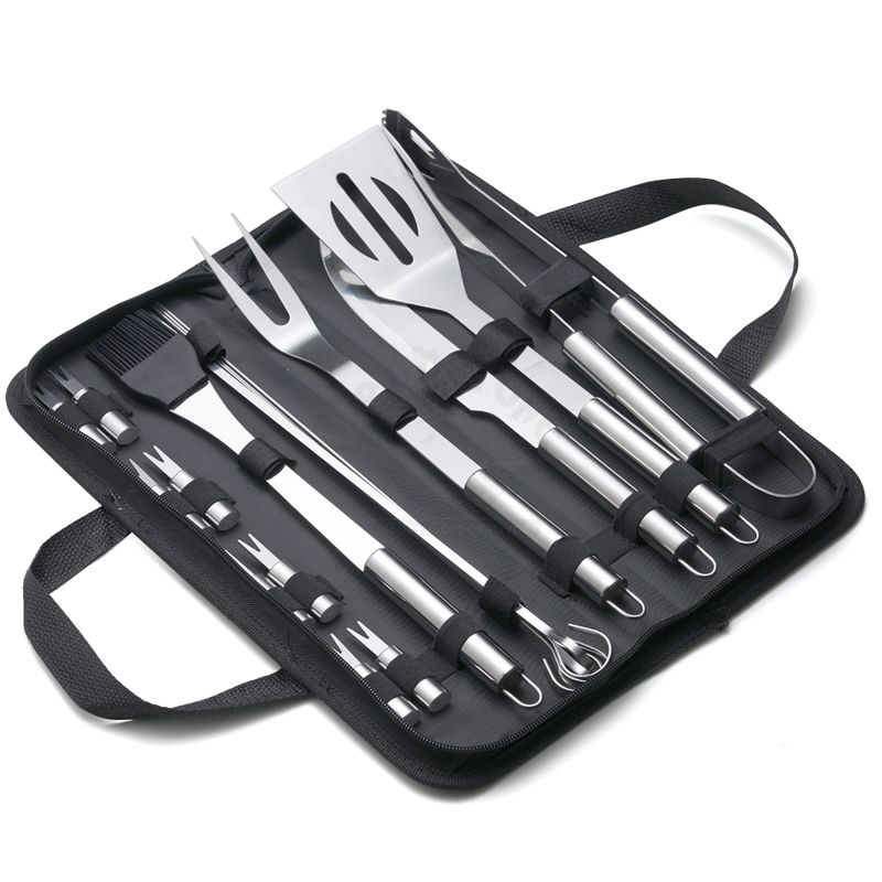 Kit Churrasco 17 Peças em estojo de nylon com alça. Contém: pegador, garfo, espátula, faca, pincel, 4 espetos e 8 garfos pequenos para petiscos. Utensílios de inox com proteções plásticas e parte interna com velcro para fixação das peças, acompanha plaquinha metálica para personalização. Ideal para brindes promocionais e eventos corporativos.
