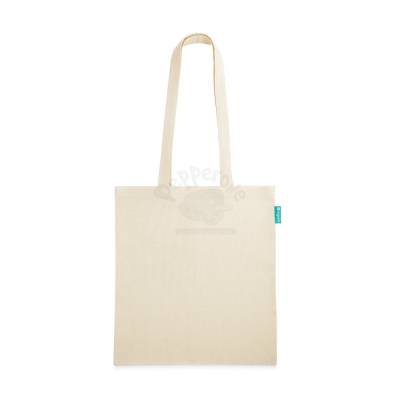 Sacola ecológica personalizada produzida em 100% algodão orgânico (120 g/m²) proveniente de um cultivo sustentável sem químicos ou pesticidas. Possui amplo espaço, alças de 60 cm e etiqueta Label Organic lateral. Ideal para brindes promocionais e eventos corporativos. Imagem ilustrativa.