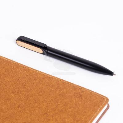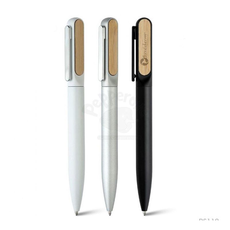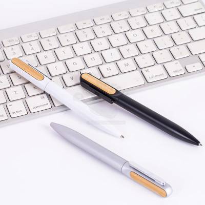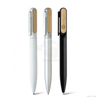 Caneta de metal personalizada com acabamento diferenciado, possui clip de metal, acabamento com detalhe em bambu e esferográfica azul com acionamento por giro. Ideal para brindes promocionais e eventos corporativos. Imagem ilustrativa.