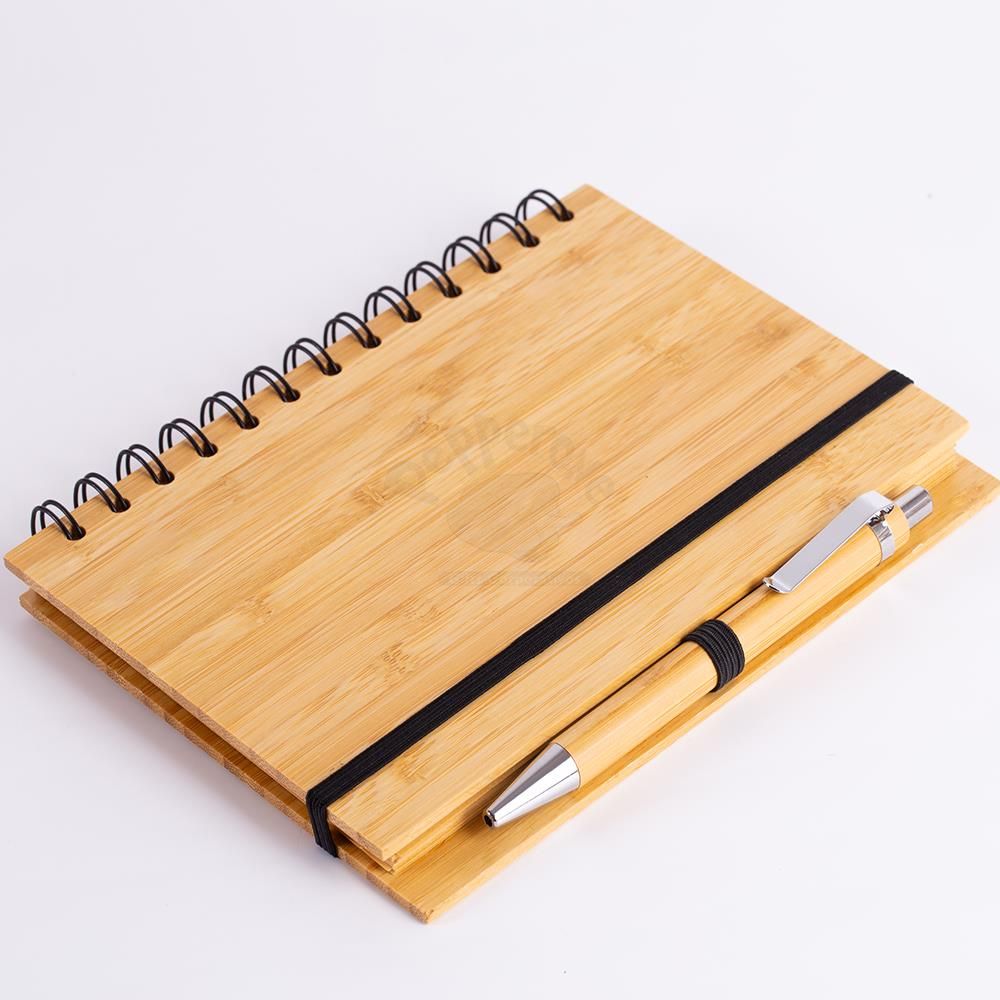 Bloco de anotações personalizado produzido em bambu com capa dura. Possui elástico para fechamento, wire-o de metal, caneta esferográfica em bambu com acionamento por clik e 70 folhas pautadas de papel reciclado. Ideal para divulgar sua empresa em eventos corporativos, brindes personalizados e campanhas promocionais.
