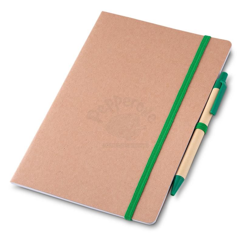 Bloco de anotações personalizado produzido em capa de papel kraft com elástico para fechamento da capa. Possui suporte lateral para caneta, miolo com 30 folhas pautadas e 1 caneta esferográfica com corpo em papel reciclado e clip plástico. Imagem ilustrativa.