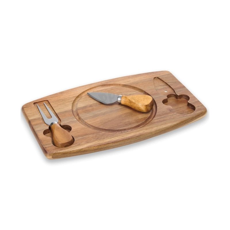Kit queijo 3 peças, contém: tábua de madeira com canaleta, faca com ponta, e garfo. Tábua com imã para encaixe e fixação dos utensílios. Ideal para brindes promocionais e eventos corporativos. Imagem ilustrativa.