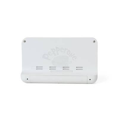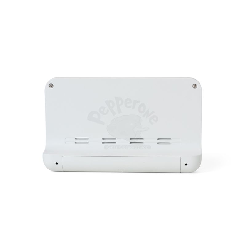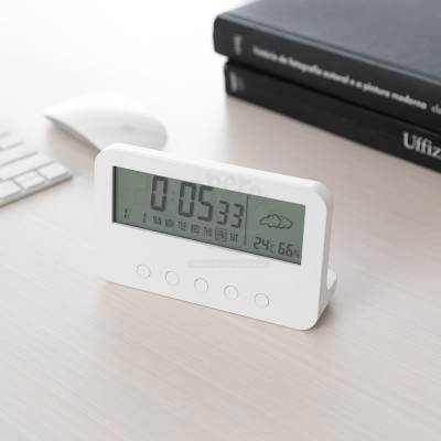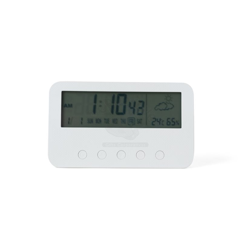 Relógio de mesa digital com alarme. Produzido em plástico, o relógio possui um display LCD com exibição das horas, dias da semana, data, alarme, relógio de contagem progressiva e regressiva, temperatura, clima e umidade, parte frontal inferior com botões para ajustes, e parte traseira com compartimento para 2 pilhas AAA (não acompanha). Acompanha manual de instruções em inglês. Ideal para brindes promocionais e eventos corporativos. Imagem ilustrativa.