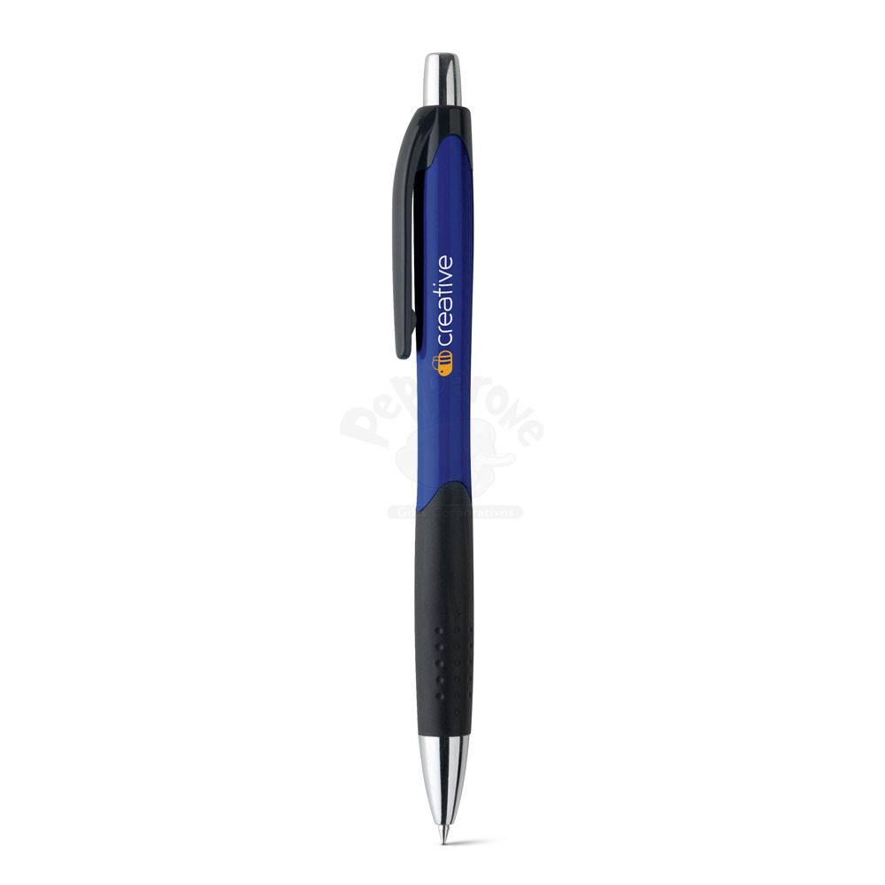 Caneta plástica personalizada com acabamento brilhante, produzida em ABS, possui escrita azul, ponteira cromada e esferográfica com acionamento por click. Ideal para brindes promocionais e eventos corporativos.