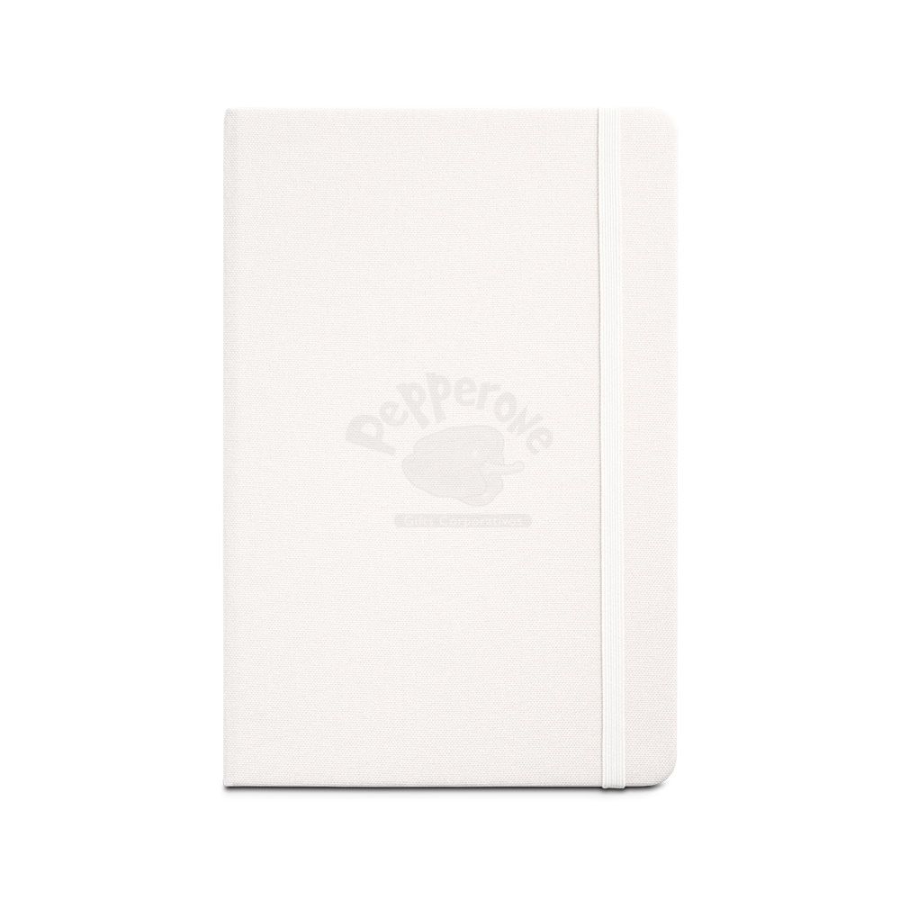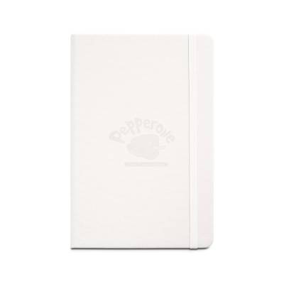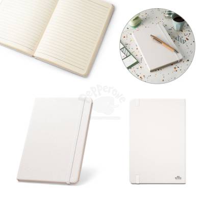 Caderno A5 em PET reciclado com tratamento antibacteriano. Contém 80 folhas pautadas cor marfim, em papel proveniente de gestão florestal sustentável, elástico e fita separadora.