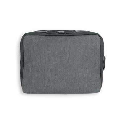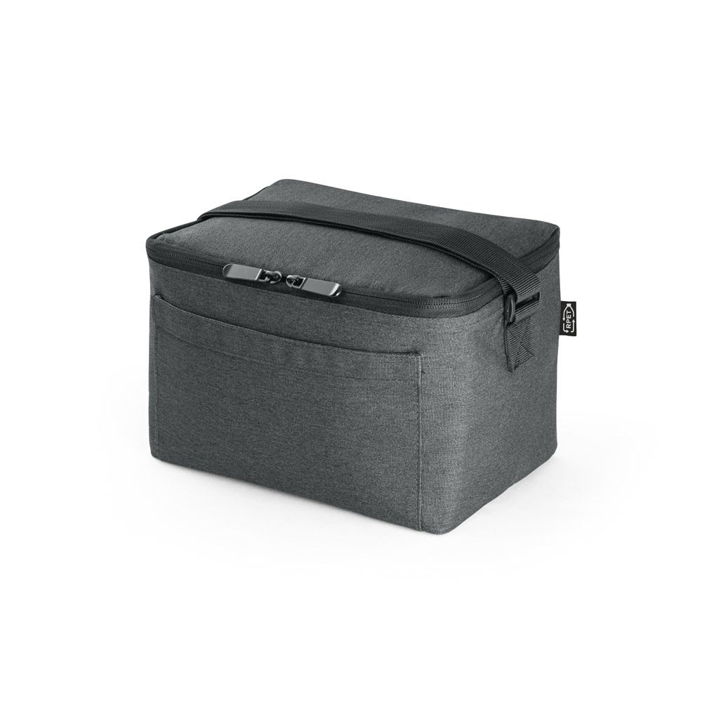 Bolsa térmica em rPET 600D com interior em PEVA. Alça ajustável em webbing, bolso frontal e fecho duplo. Capacidade até 7 Litros.